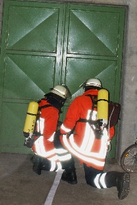 Foto2: Nach der Menschenrettung stand auch die Brandbekämpfung und Abriegelung der umliegenden Gebäude auf dem Übungsplan. Hier kontrollierte ein Atemschutztrupp eine Verbindungstür zwischen Getreidesilogebäude und Strohlager.